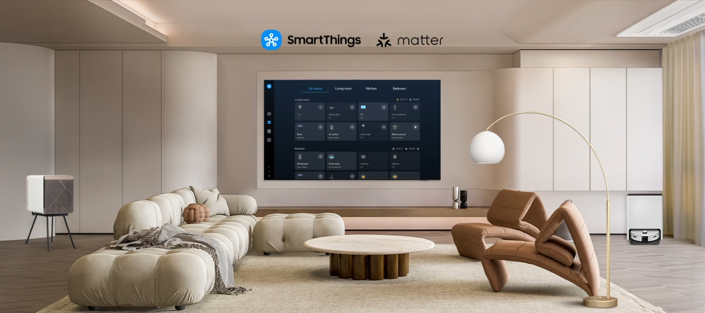 ![]() SmartThingsΜε ενσωματωμένο smart hub, η τηλεόρασή σου μπορεί να συνδεθεί σε έξυπνες συμβατές συσκευές και να τις ελέγξει, ακόμη και όσες απαιτούν συμβατότητα Matter και HCA. Μπορείς επίσης να λαμβάνεις ειδοποιήσεις για τις συσκευές σου απευθείας μέσα από την οθόνη σου, όπως μια προβολή χάρτη 3D που εμφανίζει ολόκληρο το σύστημα του smart σπιτιού σου με μια ματιά. * Η διαθέσιμη τεχνολογία, οι λειτουργίες και οι δυνατότητες ενδέχεται να διαφέρουν ανά χώρα, πάροχο υπηρεσιών, περιβάλλον δικτύου ή προϊόν και υπόκεινται σε αλλαγή χωρίς ειδοποίηση. * Απαιτείται Wi-Fi, Bluetooth ή άλλη σύνδεση σε ασύρματο δίκτυο και είσοδος σε λογαριασμό Samsung. * Οι συνδεδεμένες συσκευές διατίθενται ξεχωριστά. |